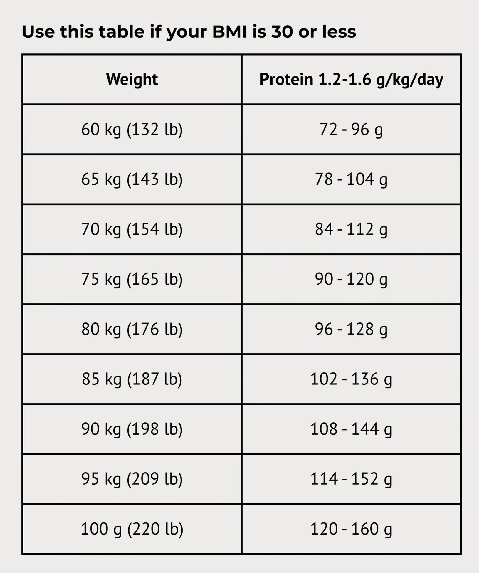 The tables below will allow you to work out how much protein in grams to eat each day.